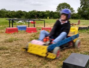 Chassis, steering, axles are all scratch-built from mild steel. Structurally similar to KAsket, but lighter. Bumpers are 12mm MDPE fished out of a skip at [posh exhibition centre location redacted] while racing indoors there.