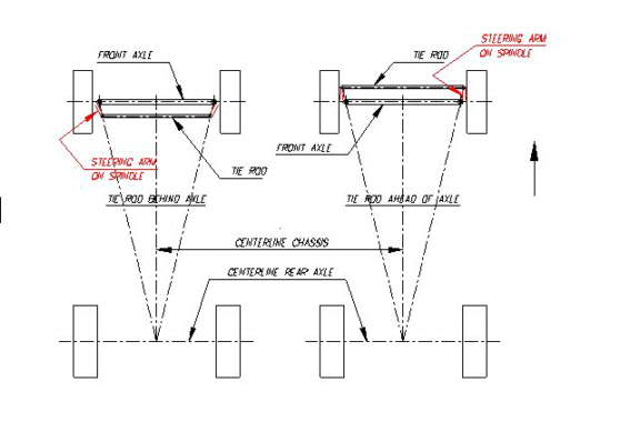 When cornering, your inside wheel needs to follow a tighter radius than your outside wheel. This can be achieved through Ackerman geometry, which through a simple mechanism, turns your inside wheel more aggressively than your outside wheel. Image credit - Vehicle Steering Systems - glue-it.co.uk The typical general rule is that your steering arms should be attached at a slight angle, so if extended from the king pin, they would cross at the centre of the rear axle. (Image Credit - TomIII- Photobucket)